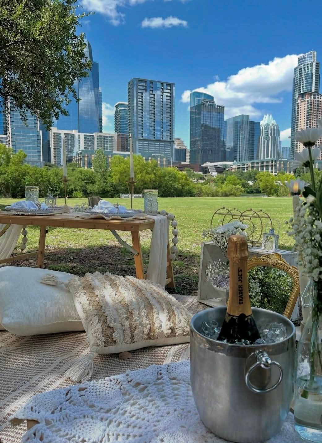 In addition to full-service wedding planning, Savvy Picnics & Events offers curated luxury picnic experiences throughout Austin. From romantic proposals and anniversaries to bridal showers and intimate celebrations, each picnic is thoughtfully styled with refined décor, layered textures, and seamless setup — creating unforgettable moments in beautiful outdoor settings.